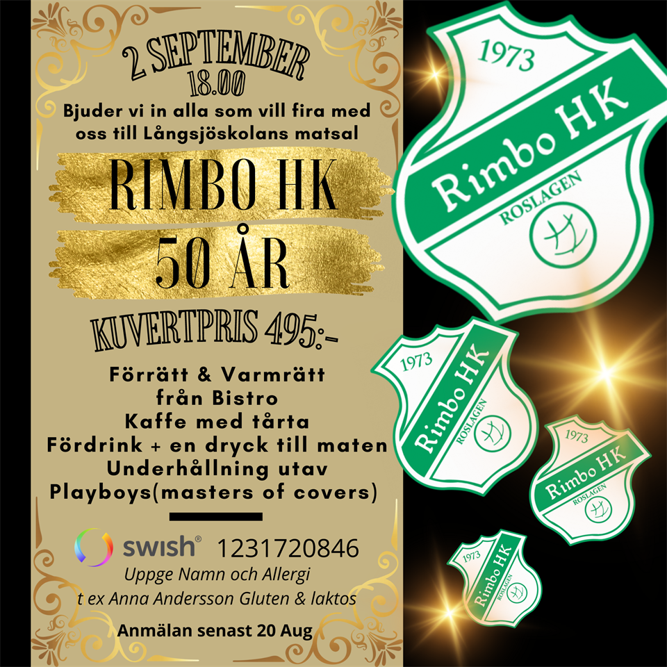 I år firar Rimbo HK 50år och det ska såklart firas! Lördagen 2 september är den stora jubileumsdagen. Under dagen kommer Sparbankshallen hålla öppet med spännande överraskningar och aktiviteter för alla barn och ungdomar. Mer specifika tider kommer inom kort. På kvällen är det middag med underhållning för alla över 18år i Långsjöskolans matsal. Det serveras två rätters signerat Centrum Bistro, samt kaffe och tårta. Underhållningen står Playboys för. Säkra din biljett för kvällen via Swish: 1231720846 Vi ser framemot att fira med er alla, barn som vuxna! Rimbo HK 8 aug 2023 0kommentarer